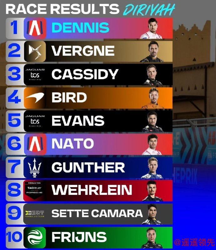 2024FE电动方程式来到沙特利雅得站,卫冕世界冠军杰克·丹尼斯拿下R2回合冠军!维尔涅最后时刻艰难守住第2位,尼克·卡西迪为捷豹带回第3名。塞尔吉奥带来为@ERT电动方程式车队 带来首个积分。