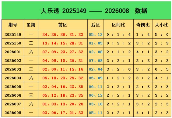 上期回顾:大乐透第2026008期奖号为:前区03、06、17、21、33,后区05、11,前区奖号三区比为2:2:1,奇偶比为4:1,大小比为2:3问鼎娱乐,后区开出小大组合05、11 前区分析 1三区分析(三区划分:一区01-12段12码,二区13-24段12码,三区25-35段11码) 一区:上期有2个奖号03、06,在前10期开奖中,该区共开出16个奖号,一区落号稍低,本期推荐该区落3个奖号,参考号码为02、10、11 二区:上期有2个奖号17、21,在前10期开奖中......查看更多