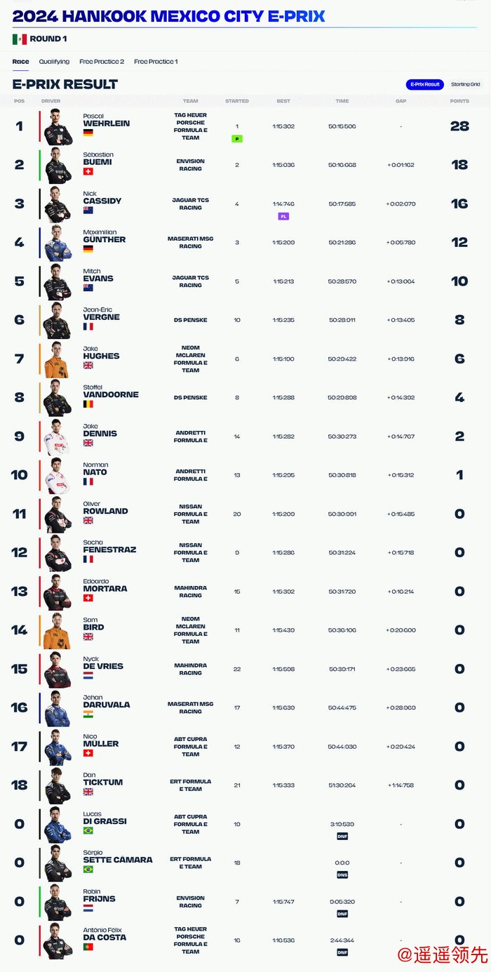 2024FE电动方程式墨西哥城站,维尔莱茵Pole to Win,为保时捷车队取得比赛冠军,布埃米为@远景电动方程式车队 带回亚军,刚刚加入捷豹的卡西迪夺取季军。冈特尔为玛莎拉蒂车队带回第4名,捷豹、DS潘世奇和安德雷蒂双积分完赛。